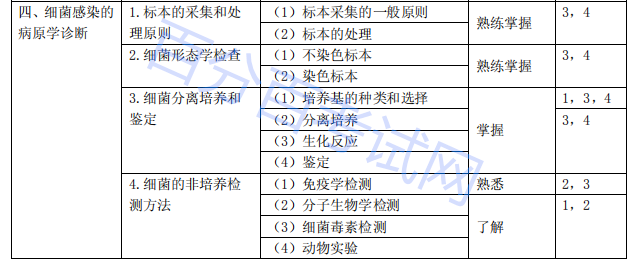 | 三十九、临床微生物学检验标本的采集 | 血液、脑脊液、脓液、痰液、粪便、尿液、生殖道标本 | (1)标本采集 | 掌握 | 3,4 |