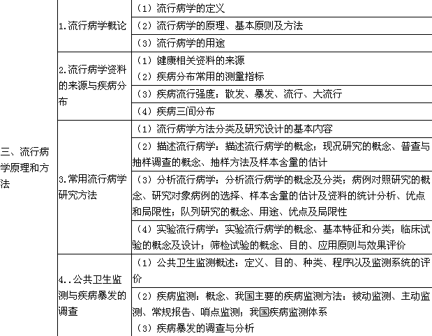 | 4.环境卫生 | (1)概述 (2)常见生物地球化学性疾病 (3)饮用水卫生:介水传染病的特点、水源选择与卫生防护、饮用水的常用消毒方法 (4)土壤污染:来源和健康危害,粪便和垃圾无害化处理 (5)室内空气污染:来源和健康危害、预防控制措施 |