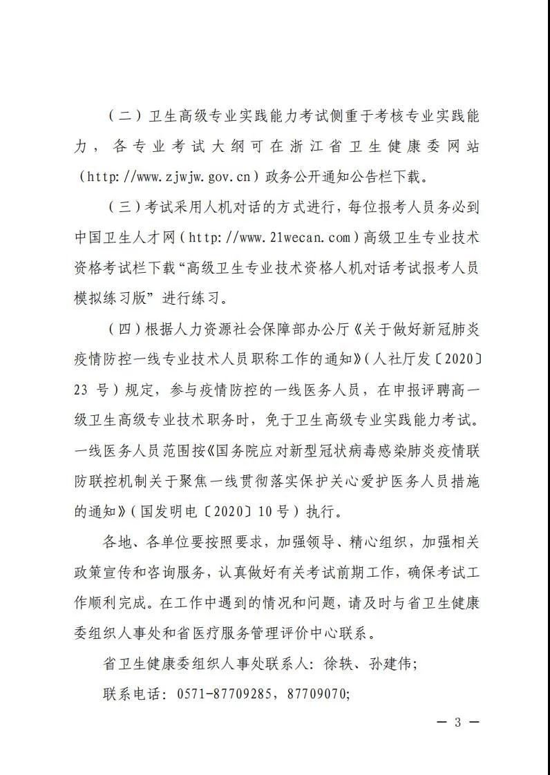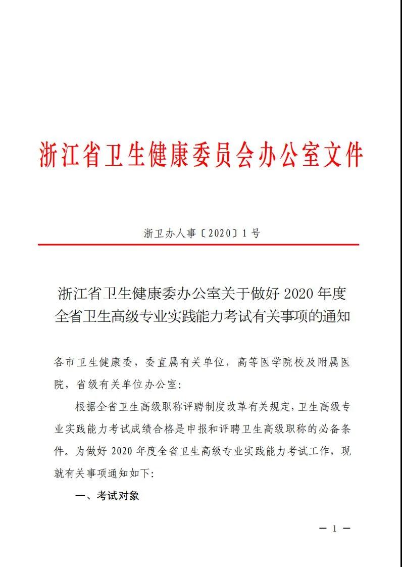 根据《浙江省卫生健康委办公室关于做好2020年度全省卫生高级专业实践能力考试有关事项的通知》(浙卫办人事[2020]1号),为做好2020年度我省卫生高级专业技术资格考试(卫生高级专业实践能力考试)的具体考务工作,现将有关事项通知如下: