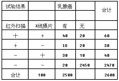 有人用红外线扫描和X线摄片两种方法在一批妇女中筛检乳腺癌,试验结果见表![]() |