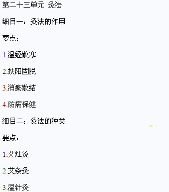 要点:常用奇穴的定位和主治要点:四神聪、太阳、夹脊、外劳宫、十宣、膝眼、胆囊、阑尾第二十二单元 毫针刺法
